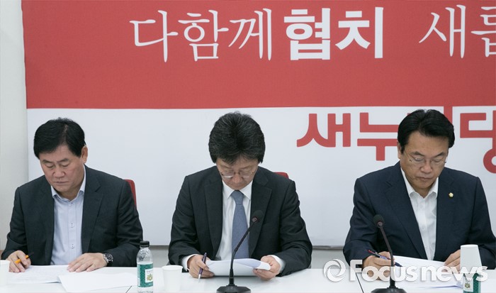 (서울=포커스뉴스) 22일 오전 서울 여의도 국회에서 열린 새누리당 신공항 관련 5개 시도 중진의원 간담회에 참석한 정진석(오른쪽부터) 원내대표, 유승민, 최경환 의원이 최정호 국토교통부 2차관의 현안보고를 받고 있다.