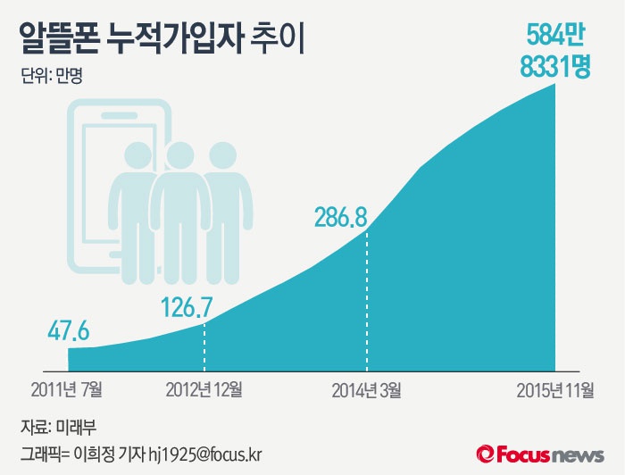 (서울=포커스뉴스) 미래창조과학부에 따르면 2015년 11월 기준 알뜰폰 누적가입자 수는 584.8만명으로 집계됐다.