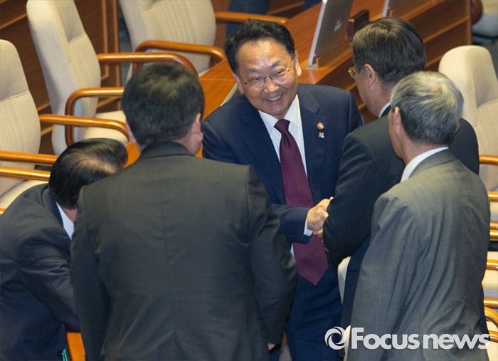 (서울=포커스뉴스) 22일 오전 서울 여의도 국회에서 열린 343회 국회(임시회) 5차 본회의에 참석한 유일호 경제부총리 겸 기획재정부 장관이 의원들과 인사하고 있다.
