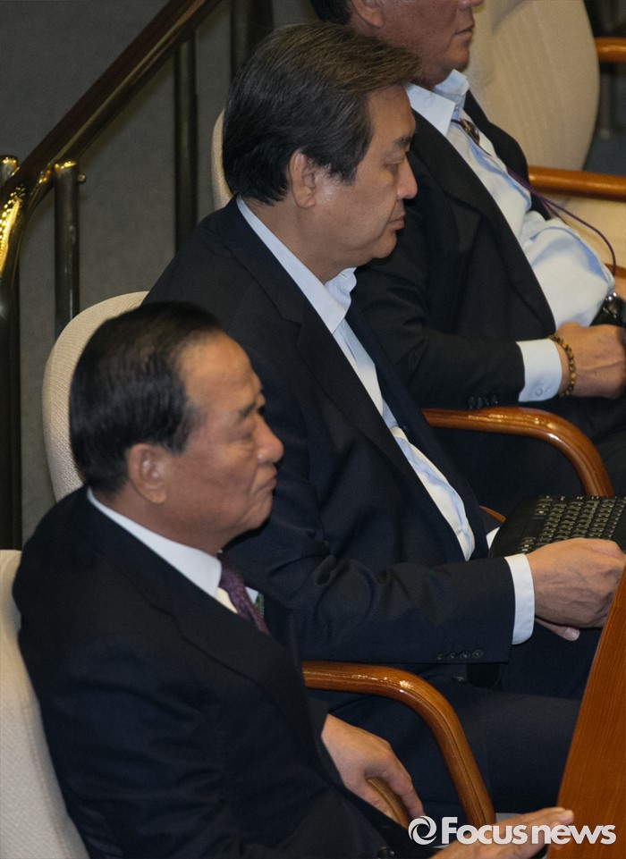 (서울=포커스뉴스) 22일 오전 서울 여의도 국회에서 열린 343회 국회(임시회) 5차 본회의에 참석한 김무성 새누리당 전 대표와 서청원 전 최고위원이 자리하고 있다.