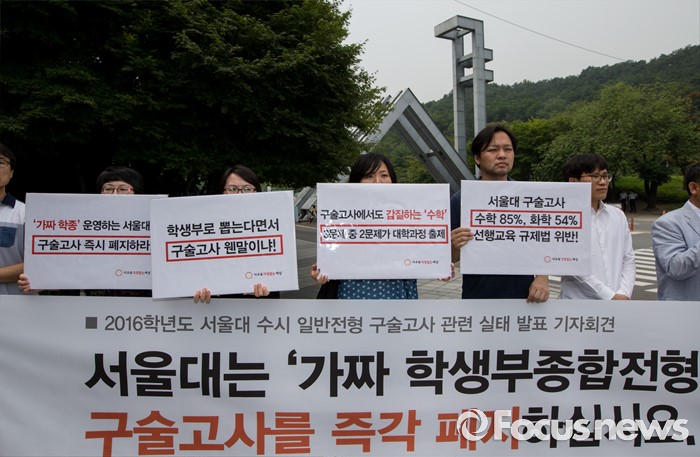 (서울=포커스뉴스) 22일 오전 서울대학교 정문 앞에서 시민단체 '사교육걱정없는세상' 회원들이 '2016학년도 서울대 수시 일반전형 구술고사 관련 실태 발표' 기자회견을 열고 있다.