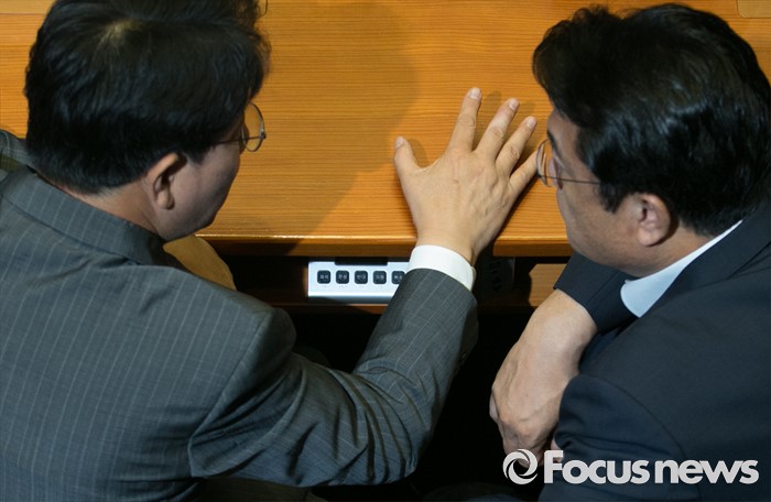 (서울=포커스뉴스) 22일 오전 서울 여의도 국회에서 열린 343회 국회(임시회) 5차 본회의에 참석한 정진석(오른쪽) 새누리당 원내대표와 권성동 사무총장이 대화하고 있다.