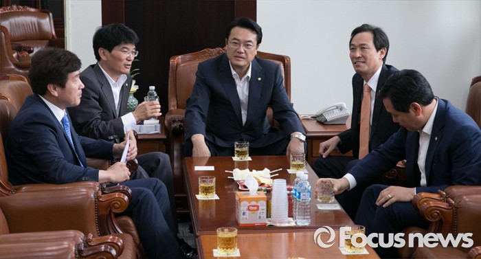 (서울=포커스뉴스) 22일 오전 서울 여의도 국회에서 운영위원회 전체회의를 마친 뒤 정진석 새누리당 원내대표, 우상호 더불어민주당 원내대표 등 의원들이 음료를 마시며 논의하고 있다. 왼쪽부터 기동민 더불어민주당 원내대변인, 박완주 원내수석부대표, 정진석 새누리당 원내대표, 우상호 더불어민주당 원내대표, 김관영 국민의당 원내수석부대표.
