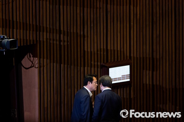 (서울=포커스뉴스) 정진석 새누리당 원내대표와 김무성 새누리당 전 대표가 22일 오전 서울 여의도 국회에서 열린 본회의에 참석해 대화 하고 있다.