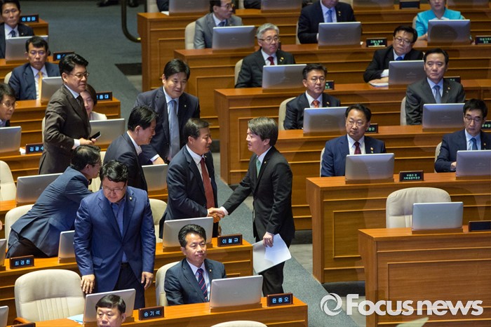 (서울=포커스뉴스) 안철수 국민의당 상임공동대표가 22일 오전 서울 여의도 국회에서 열린 본회의에 참석해 교섭단체대표연설을 마친 뒤 동료 의원들과 악수 하고 있다.