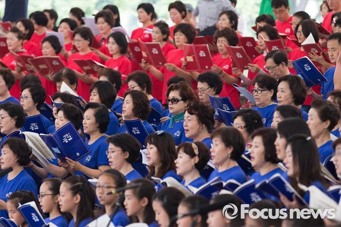 (서울=포커스뉴스) 22일 오전 서울 송파구 서울놀이마당에서 열린 '통일대합창, 625명이 함께하는 평화공감' 행사에 참가한 송파구민들이 합창하고 있다. 이번 행사는 관내 합창단과 노래동아리 등 송파구민 1000여명이 신청해 2주전부터 개별적으로 연습 한 후 통일대합창에 참가 했다.