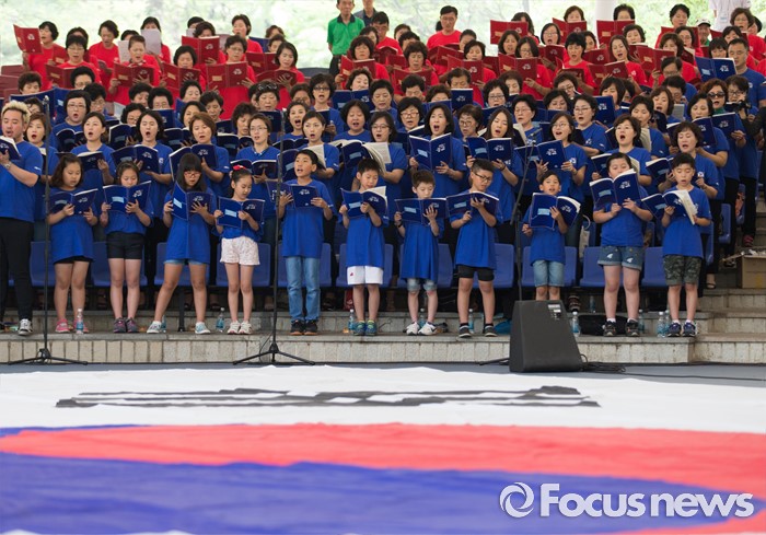 (서울=포커스뉴스) 22일 오전 서울 송파구 서울놀이마당에서 열린 '통일대합창, 625명이 함께하는 평화공감' 행사에 참가한 송파구민들이 합창하고 있다. 이번 행사는 관내 합창단과 노래동아리 등 송파구민 1000여명이 신청해 2주전부터 개별적으로 연습 한 후 통일대합창에 참가 했다.