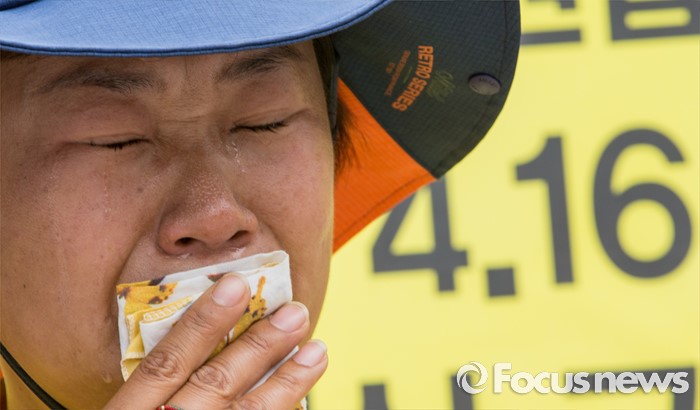 (서울=포커스뉴스) 세월호 참사 800일을 하루 앞둔 22일 오전 서울 종로구 광화문 광장에서 열린 '세월호 특별법 개정 촉구와 800일 계기수업 선포' 기자회견에 참석한 고 오영석군 어머니 권미화씨가 눈물을 흘리고 있다.