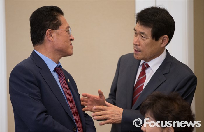 (서울=포커스뉴스)22일 오후 서울 여의도 국회에서 열린 비박계 새누리당 의원들이 주축이 된 '대한민국 미래혁신포럼' 창립 총회에서 정운천(왼쪽) 의원과 이군현 의원이 대화하고 있다.