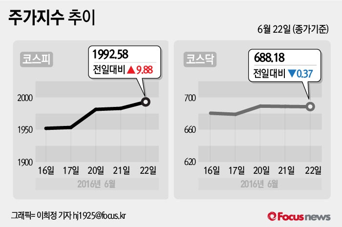 (서울=포커스뉴스) 22일 코스피지수는 전날 보다 0.50%(9.88포인트) 오른 1992.58에 장을 마쳤다. 코스닥지수는 전일 대비 0.05%(0.37포인트) 내린 688.18에 마감했다.