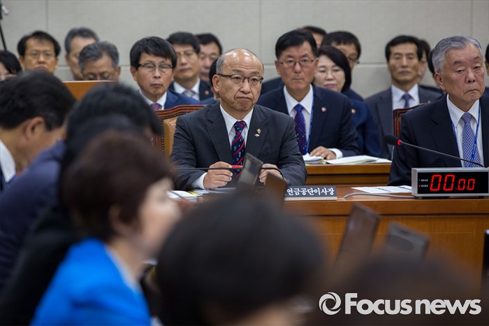 (서울=포커스뉴스) 문형표 국민연금공단 이사장이 22일 오후 서울 여의도 국회에서 열린 '보건복지위원회 전체회의'에 참석해 김상희 국회 보건복지위원회 더불어민주당 위원의 의사 발언을 듣고 있다. 이날 김 위원은 문 이사장에게 2015년 메르스 사태 당시 보건복지부 장관을 중간에 사퇴한 이유로 국정감사 출석에 불응한 것과 메르스 사태 미수습에 대해 사과할 것을 요구 했다.