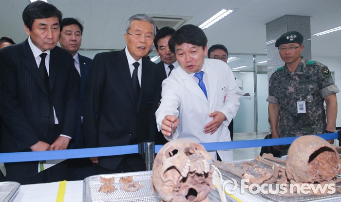 (서울=포커스뉴스) 김종인 더불어민주당 비대위 대표와 의원들이 22일 오후 서울 동작구 국립서울현충원 내 국방부 유해발굴감식단 중앙감식소를 방문해 감식 중인 유해를 살펴보고 있다.