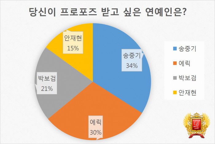이에 따르면, 프로포즈 받고 싶은 연예인을 묻는 질문에서 송중기와 에릭이 각각 34%(140명), 30%(123명)의 지지를 얻으며 나란히 1·2위를 차지했다.