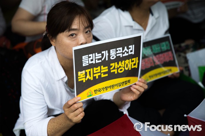 (서울=포커스뉴스) 22일 오후 서울 여의도 산업은행 본점 후문에서 한국가정어린이집연합회 비대위가 주최하는 '맞춤형 복지 시행 반대 단식 농성'이 열리고 있다.
