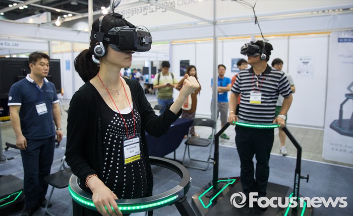 (고양=포커스뉴스) 22일 오후 경기 고양시 킨텍스 7홀에서 열린 2016 로보유니버스 & VR 서밋에 방문한 시민들이 VR 기기를 체험하고 있다.