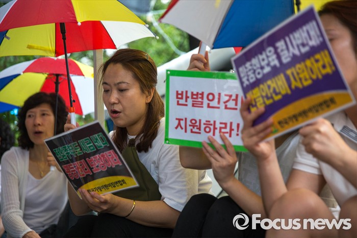 (서울=포커스뉴스) 22일 오후 서울 여의도 산업은행 본점 후문에서 한국가정어린이집연합회 비대위가 주최하는 '맞춤형 복지 시행 반대 단식 농성'이 열리고 있다.