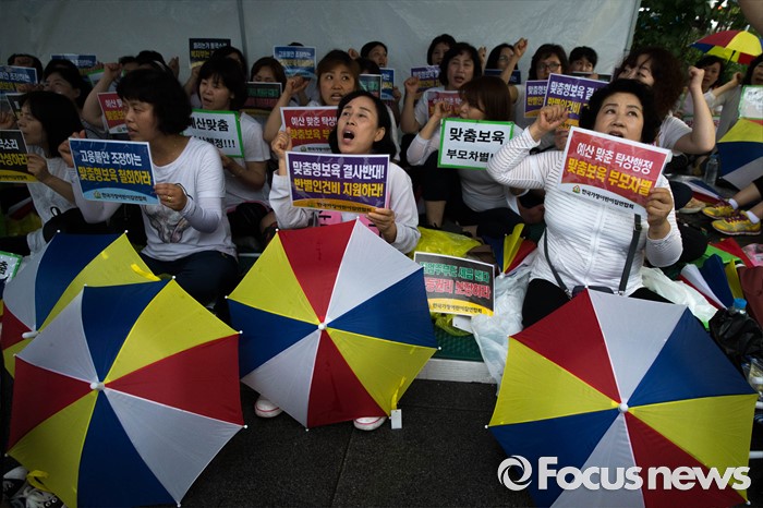 (서울=포커스뉴스) 22일 오후 서울 여의도 산업은행 본점 후문에서 한국가정어린이집연합회 비대위가 주최하는 '맞춤형 복지 시행 반대 단식 농성'이 열리고 있다.