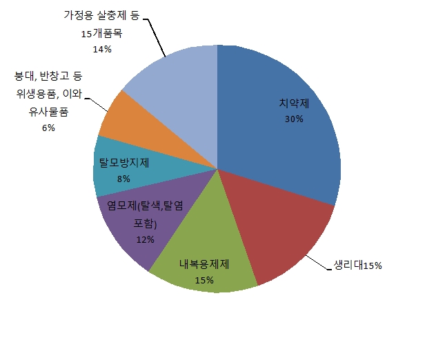 생활 속에 많이 사용되는 치약제, 생리대, 내복용 제품, 염모제, 탈모방지제 등 5개 품목군의 생산실적은 1조4735억원으로 지난해와 마찬가지로 전체 생산실적의 80%를 차지했다.
