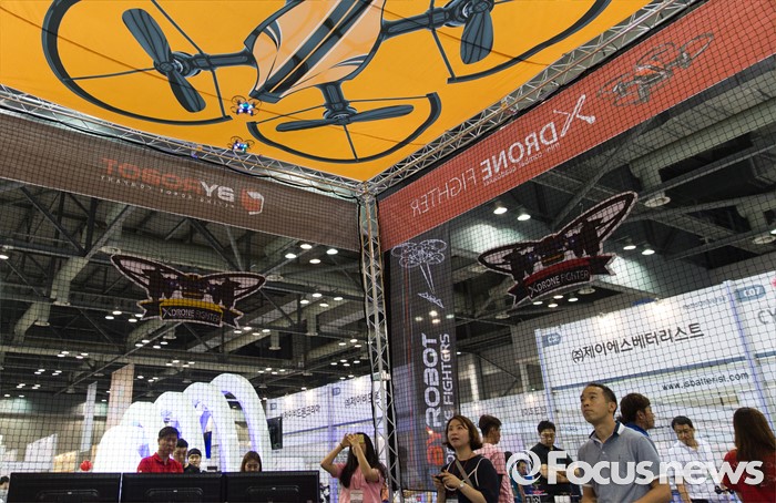 (고양=포커스뉴스) 22일 오후 경기 고양시 킨텍스 7홀에서 열린 2016 로보유니버스 & VR 서밋에 방문한 시민들이 드론을 체험하고 있다.