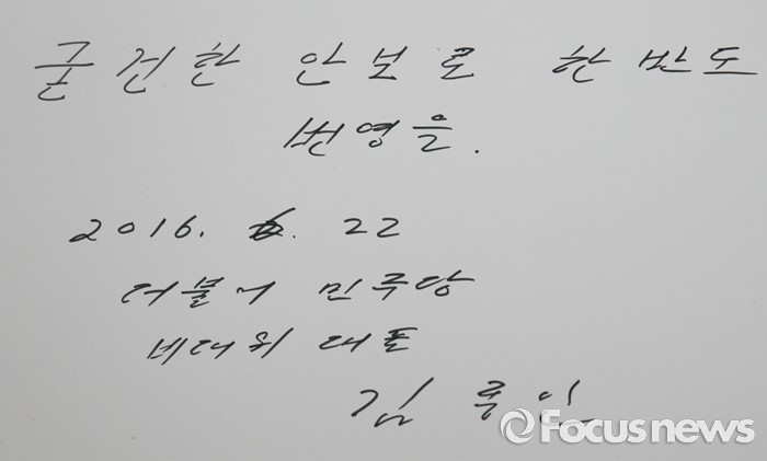 (서울=포커스뉴스) 김종인 더불어민주당 비대위 대표가 22일 오후 서울 동작구 국립서울현충원 내 국방부 유해발굴감식단 방문에 앞서 현충탑 참배를 마친 뒤 방명록을 작성했다. 사진은 김 대표가 남긴 글귀.