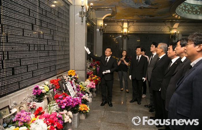 (서울=포커스뉴스) 김종인 더불어민주당 비대위 대표와 의원들이 22일 오후 서울 동작구 국립서울현충원 내 국방부 유해발굴감식단 방문에 앞서 현충탑 내부의 위패봉안관을 둘러보고 있다.