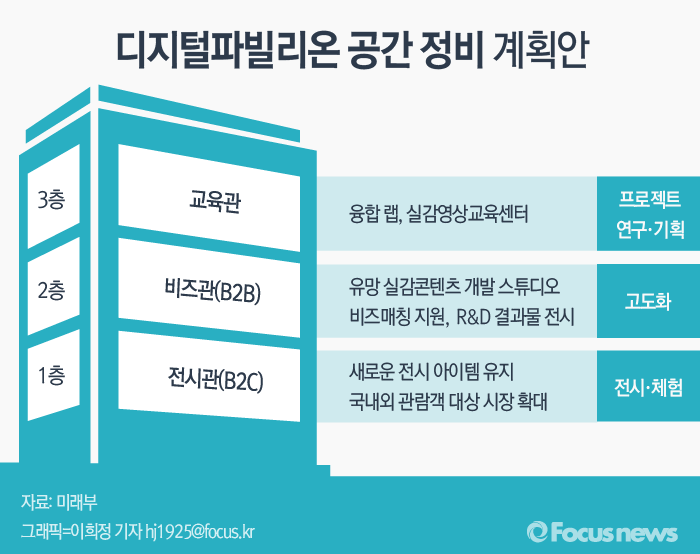 (서울=포커스뉴스) 22일 미래창조과학부는 상암 DMC 누리꿈스퀘어 디지털파빌리온을 우리 기업이 개발하는 실감콘텐츠를 연구하고 테스트해 고도화·상용화 할 수 있는 ‘개방형 연구·전시 공간’으로 재구성할 계획이라고 밝혔다.