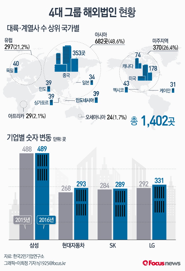 (서울=포커스뉴스) 한국2만기업연구소가 22일 발표한 '국내 4대 그룹 해외 계열사 현황 분석'에 따르면 올해 확인된 해외 법인 수는 1402곳으로 지난해 1332곳 보다 70곳이 늘어났다.