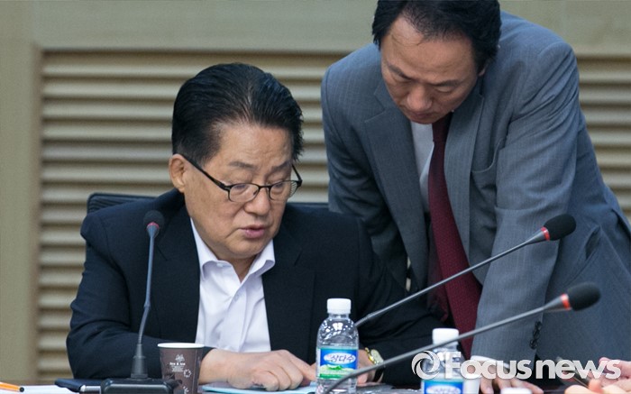 (서울=포커스뉴스) 23일 오전 서울 여의도 국회에서 열린 국민의당 19차 정책역량강화 워크숍에 참석한 박지원(왼쪽) 원내대표와 김명진 원내대표비서실장이 대화하고 있다.