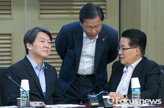 (서울=포커스뉴스) 23일 오전 서울 여의도 국회에서 열린 국민의당 19차 정책역량강화 워크숍에 참석한 안철수(왼쪽부터) 상임공동대표, 천정배 공동대표, 박지원 원내대표가 대화하고 있다.