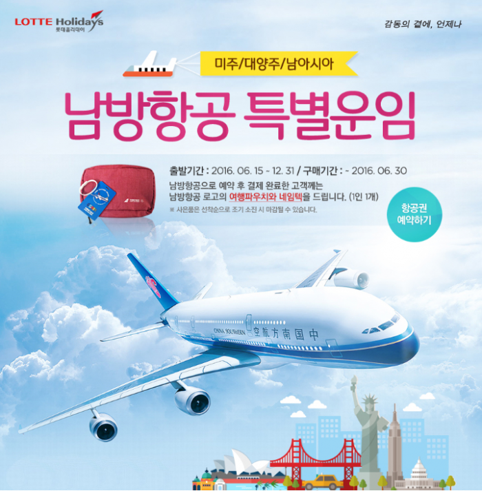 남방항공으로 예약 뒤 결제 완료한 고객에게 남방항공 로고의 여행 파우치, 네임택을 1인 1개 선사한다. 연말까지 항공권을 구입할 수 있는 이번 기획전은 오는 30일까지 진행된다.여행사 롯데제이티비는 미주, 대양주, 남아시아 남방항공 특별운임 기획전을 오픈했다. <사진제공=롯데제이티비>