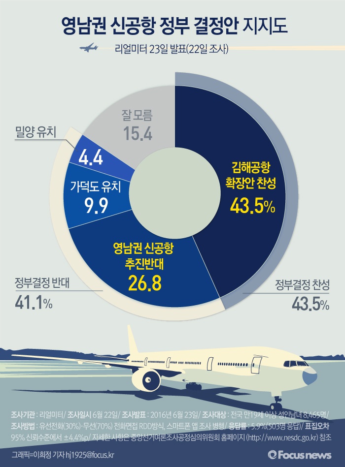 (서울=포커스뉴스) 리얼미터가 CBS '김현정의 뉴스쇼' 의뢰로 23일 발표한 여론조사결과에 따르면 국민 43.5%는 정부의 김해공항 확장안에 찬성하는 뜻을 나타냈다. 이어 '영남권 신공항을 처음부터 추진하지 말았어야 했다'는 응답이 두 번째로 많은 26.8%로 집계됐다.