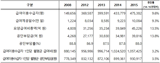 급여이용수급자 수는 2008년 장기요양제도 시행 첫 해 14만9000명에서 2015년 47만5000명으로 약 3.2배 증가했다.