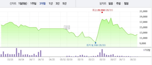 한편, 현대상선 채권단 오는 28일로 예정된 자율협약(채권단 공동관리) 마감 시한을 7월 28일까지 한 달 연장하기로 결정했다. 현대상선과 채권단은 지난 3월 조건부 자율협약을 맺었다.주가흐름<사진출처=네이버 캡쳐>