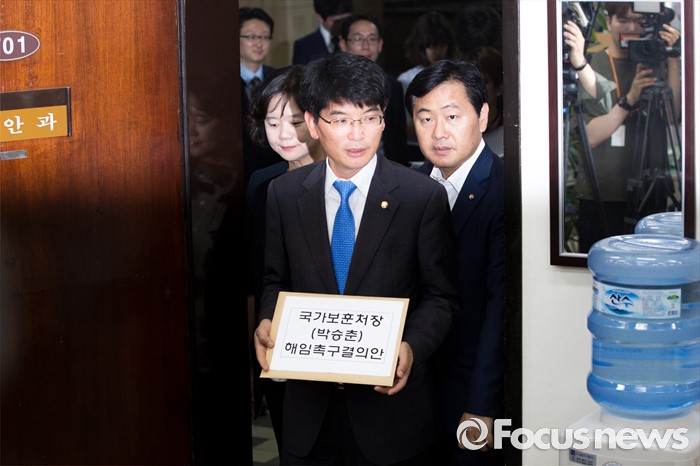 (서울=포커스뉴스) 야3당 원내수석부대표들이 23일 오전 서울 여의도 국회에서 박승춘 국가보훈처장 해임촉구결의안을 제출하기 위해 의안과로 들어서고 있다. 왼쪽부터 이정미 정의당 원내수석부대표, 박완주 더불어민주당 원내수석부대표, 김관영 국민의당 원내수석부대표.
