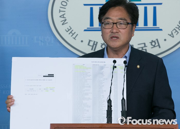 (서울=포커스뉴스) 국회 산업통상자원위원회 소속 우원식 더불어민주당 의원이 23일 오전 서울 여의도 국회 정론관에서 신고리 5, 6호기 건설허가 전 공사가 진행되고 있다는 내용의 자료를 들고 기자회견을 하고 있다.