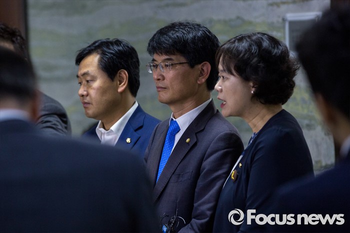 (서울=포커스뉴스) 야3당 원내수석부대표들이 23일 오전 서울 여의도 국회 의안과에서 박승춘 국가보훈처장 해임촉구결의안을 전달한 뒤 취재진 질문에 답하고 있다. 왼쪽부터 이정미 정의당 원내수석부대표, 박완주 더불어민주당 원내수석부대표, 김관영 국민의당 원내수석부대표.
