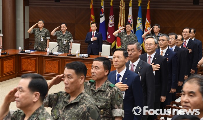 (서울=포커스뉴스) 북한이 무수단급 중거리 탄도미사일을 발사한 다음날인 23일 오전 서울 용산구 국방부 대회의실에서 열린 '2016년 전반기 전군 주요지휘관 회의'에 참석한 한민구 국방부 장관과 전군 지휘관들이 국민의례를 하고 있다.