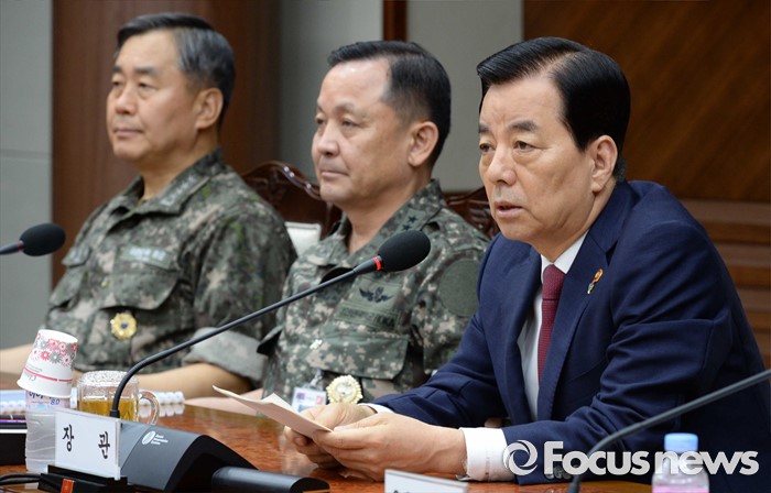 (서울=포커스뉴스) 북한이 무수단급 중거리 탄도미사일을 발사한 다음날인 23일 오전 서울 용산구 국방부 대회의실에서 열린 '2016년 전반기 전군 주요지휘관 회의'에 참석한 한민구(오른쪽) 국방부 장관이 모두발언 하고 있다.
