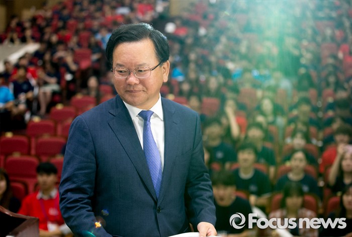 (서울=포커스뉴스) 전당대회 불출마를 선언하고 대권 도전을 시사한 김부겸 더불어민주당 의원이 23일 오전 서울 여의도 국회 의원회관에서 열린 대학생리더십 아카데미에 참석해 특강을 위해 단상으로 향하고 있다.
