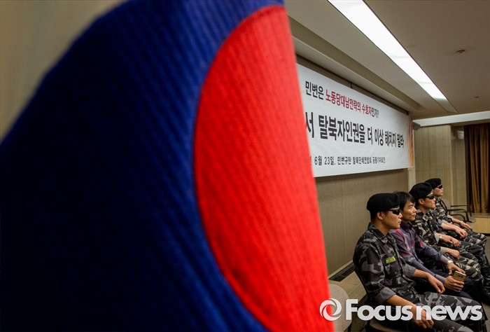 (서울=포커스뉴스) 23일 오전 서울 중구 프레스센터에서 탈북민단체연합 회원들이 '12명 탈북민들을 사지로 내모는 민변 규탄 및 고발' 기자회견을 갖고 있다.
