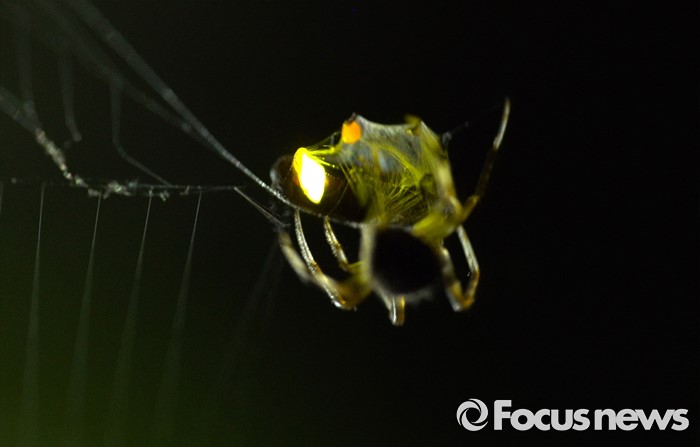 (서울=포커스뉴스) 운문산반디불이가 비행중 거미줄에 걸렸지만, 거미가 포획하기 전 이라 발광을 계속하고 있다. <사진제공=임완호감독>