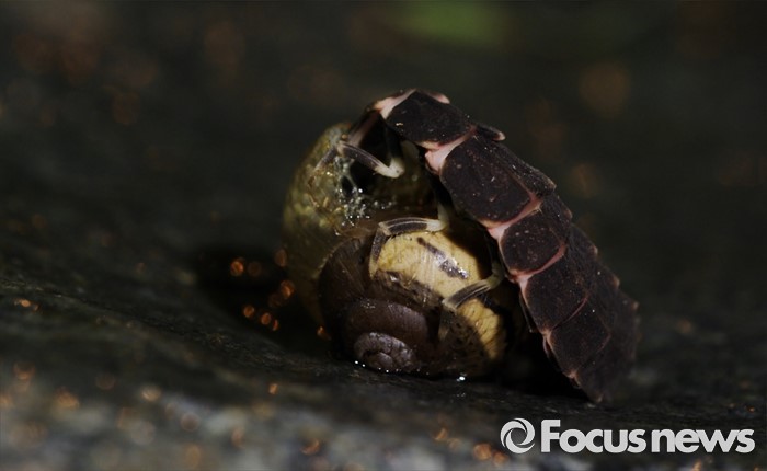 (서울=포커스뉴스) 늦반디불이 암컷 애벌레가 달팽이를 사냥하고 있다.<사진제공=임완호감독>