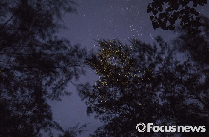 (서울=포커스뉴스) 인도네시아 크리스마스트리에서 반디불이들이 떼를 지어 발광하면서 밤하늘을 녹색발광체로 수놓고 있다. <사진제공=임완호감독>