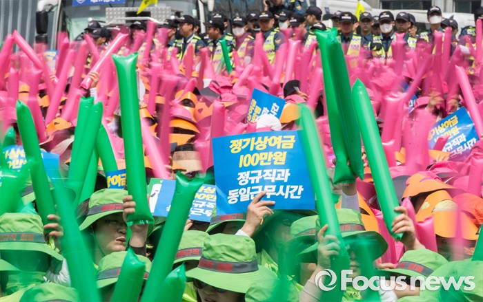 (서울=포커스뉴스) 23일 오전 서울 종로구 서울시 교육청 인근에서 전국학교비정규직 노동조합원과 공공운수노조 전국 교육공무직 본부원들이 '학교급식 인원보강 및 처우개선 철야대기 학교비정규직 처우개선 임단협 승리 총파업 결의대회' 를 하고 있다.