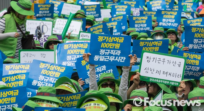 (서울=포커스뉴스) 23일 오전 서울 종로구 서울시 교육청 인근에서 전국학교비정규직 노동조합원과 공공운수노조 전국 교육공무직 본부원들이 '학교급식 인원보강 및 처우개선 철야대기 학교비정규직 처우개선 임단협 승리 총파업 결의대회' 를 하고 있다.