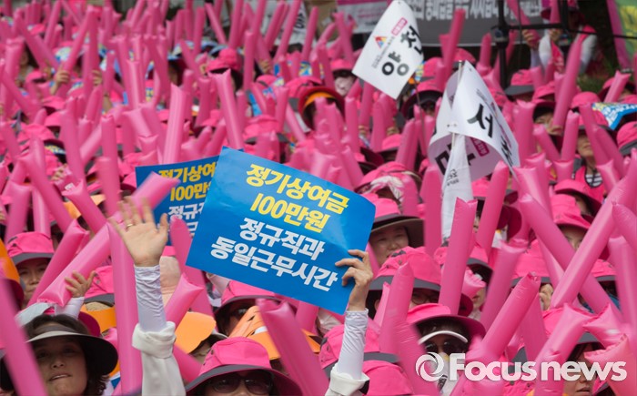 (서울=포커스뉴스) 23일 오전 서울 종로구 서울시 교육청 인근에서 전국학교비정규직 노동조합원과 공공운수노조 전국 교육공무직 본부원들이 '학교급식 인원보강 및 처우개선 철야대기 학교비정규직 처우개선 임단협 승리 총파업 결의대회' 를 하고 있다.