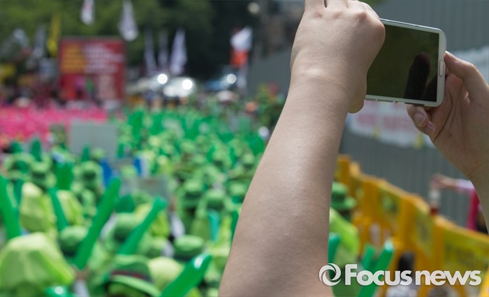 (서울=포커스뉴스) 23일 오전 서울 종로구 서울시 교육청 인근에서'학교급식 인원보강 및 처우개선 철야대기 학교비정규직 처우개선 임단협 승리 총파업 결의대회'에 참여한 한 조합원이 사진을 찍고 있다.