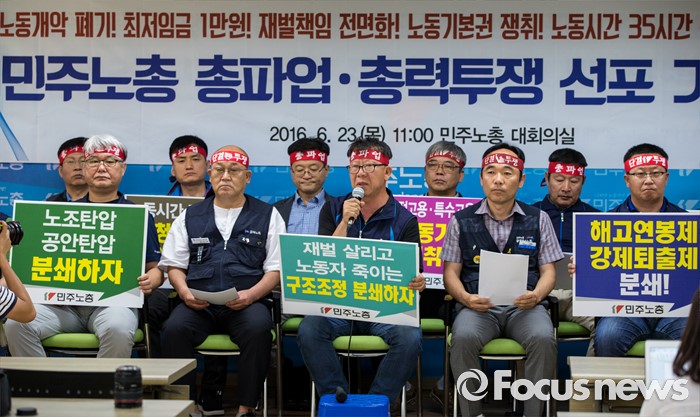 (서울=포커스뉴스) 23일 오전 서울 중구 민주노총 대회의실에서 열린 '민주노총 총파업ㆍ총력투쟁 선포' 기자회견에 참석한 최종진 수석부위원장이 총파업을 결의하는 발언을 하고 있다.
