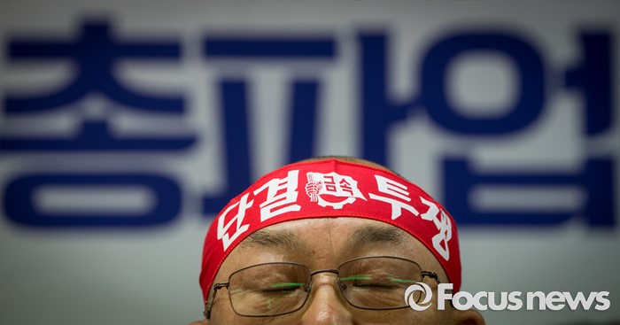 (서울=포커스뉴스) 23일 오전 서울 중구 민주노총 대회의실에서 열린 '민주노총 총파업ㆍ총력투쟁 선포' 기자회견에 참석한 오상룡 금속노조 사무처장이 눈을 감고 있다.