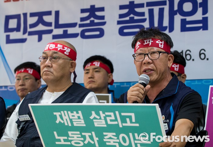 (서울=포커스뉴스) 23일 오전 서울 중구 민주노총 대회의실에서 열린 '민주노총 총파업ㆍ총력투쟁 선포' 기자회견에 참석한 최종진 수석부위원장이 총파업을 결의하는 발언을 하고 있다.
